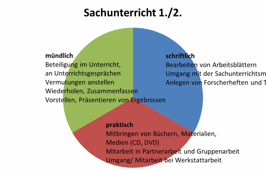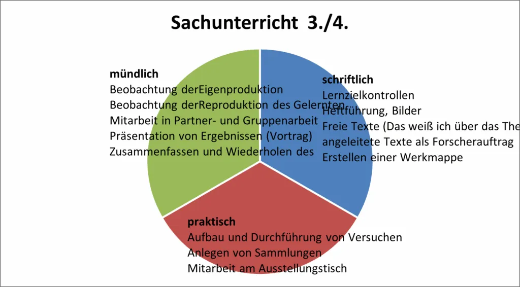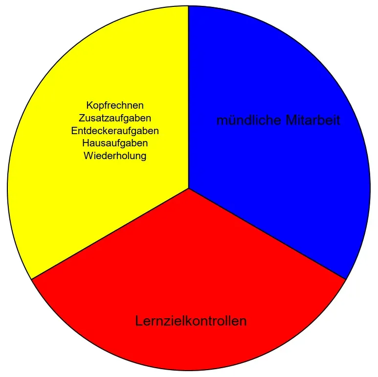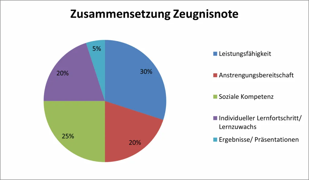 Die Zusammensetzung der Zeugnisbeurteilung (im 3. und 4. Schuljahr auch Zensur) wird den Eltern auf der ersten Schulpflegschaftssitzung im Schuljahr und den Kindern zu Beginn des Schuljahres durch ein Kreisdiagramm (siehe unten) transparent gemacht.